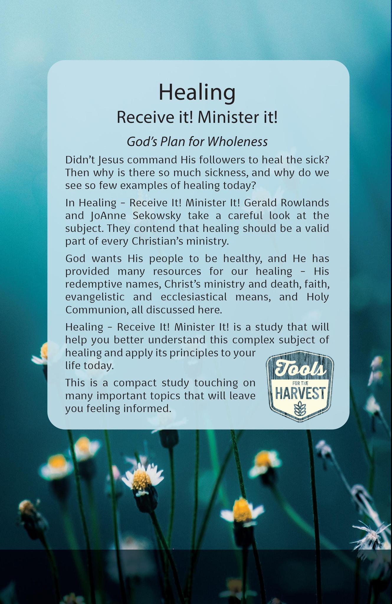 In Healing – Receive it! Minister it! Authors Gerald Rowlands and JoAnne Sekowsky take a careful look at the subject. They contend that healing should be a valid part of every Christian’s ministry.